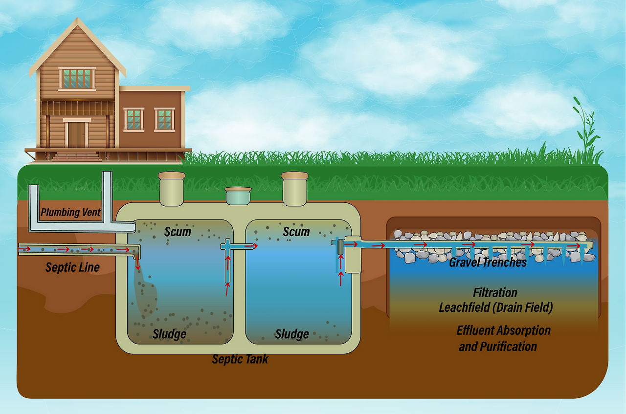 기존의 정화조는 혐기성(산소를 싫어하는, 산소가 필요 없는) 시스템이라고도 하며 호기성(산소를 좋아하는, 산소가 필요한) 시스템보다 훨씬 간단하고 저렴합니다. 이 시스템은 폐기물을 정화조로 흡입하고, 고형물은 바닥으로 가라앉힙니다. 가정에서 나오는 하수는 같은 정화조로 유입되어 위로 떠올라 거품층 (부상물 층: Scum Layer)을 형성합니다. 정화조 내 혐기성 박테리아는 고형물을 분해하여 배관을 통과하여 최종 단계인 배수장으로 이동합니다. 최종 폐수는 배수장에 뿌려지므로 일부는 증발하고 일부는 지표면을 따라 흘러가거나 대부분 땅속으로 스며들게 됩니다.