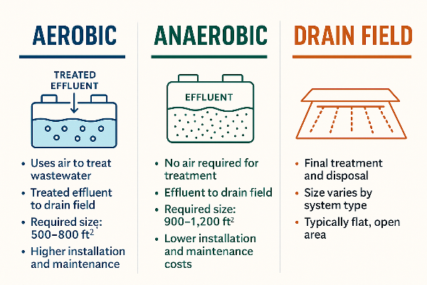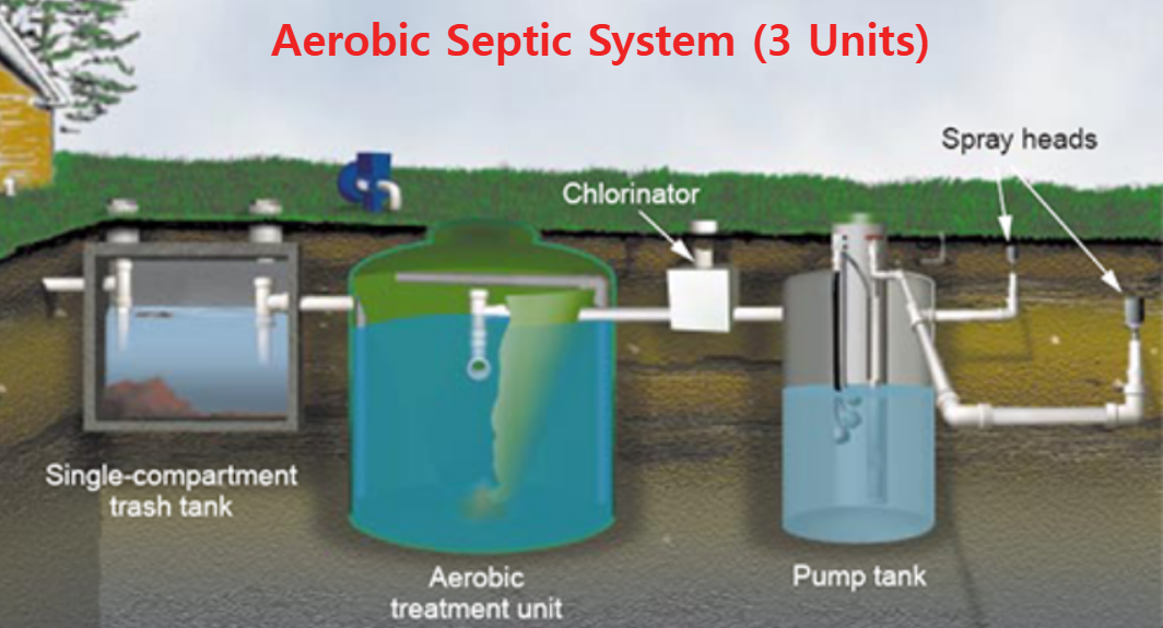 통상 Septic은 혐기성 정화조를 뜻하며, Aerobic이라고 해야 호기성 정화조로 이해하는 경우가 많습니다. 두 방식 모두 최종적으로는 배수장(drain field 혹은 leach field)을 통해 남은 오염물질을 토양에서 여과·분해해야 합니다. 토양의 투수성, 지하수위, 처리수량 등을 고려해 배수장 크기를 산정하며, 호기성 시스템은 처리수의 품질이 더 좋아 동일 조건에서 배수장 크기를 30~50% 줄일 수 있습니다.