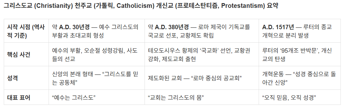 그리스도교는 예수 그리스도의 복음으로부터 시작된 신앙(A.D. 30년경)이며, 로마 제국 국교화 이후 제도화된 교회가 천주교(A.D. 380년경), 그 천주교의 개혁운동으로 다시 복음의 본질로 돌아간 것이 개신교(A.D. 1517년)입니다.
